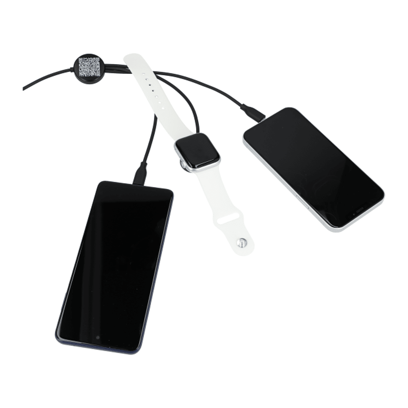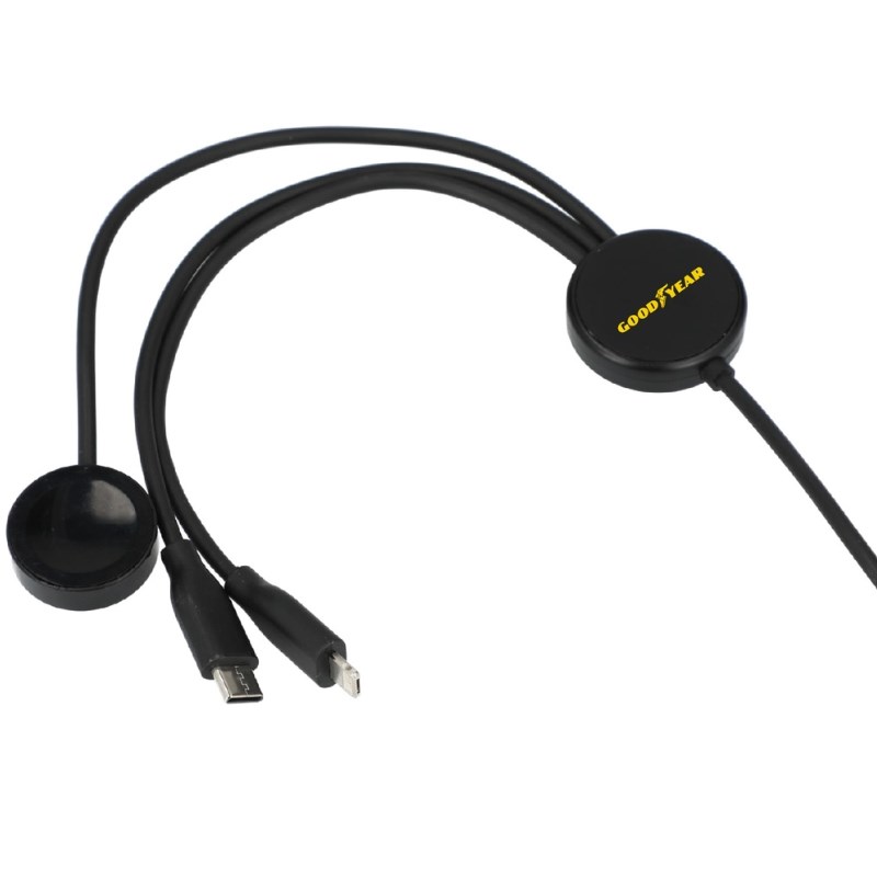 The 5-in-1 Long Charging Cables with iWatch Charger is a versatile, eco-friendly solution for your charging needs. Measuring 47 inches, it includes a USB Type-A adapter and a USB Type-C input tip on one side, and on the other side, a dual compatible tip for Apple iOS and Android devices, a USB Type-C output tip, and an iWatch charger. The casing is made from 100% recycled materials. For optimal performance, it's recommended to use an AC adapter, power bank, or car charger. Product comes in black, and is decorated with the Goodyear Corporate Logo.