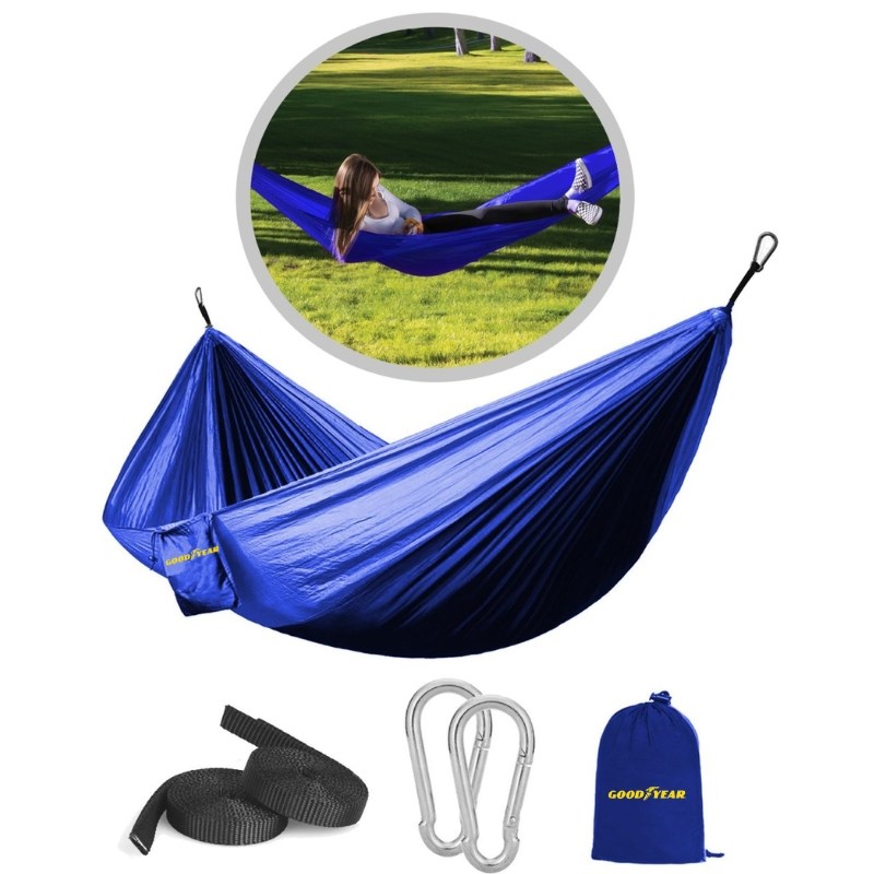 Take time to relax outdoors! This portable hammock is made of heavy duty polyester that packs into itself so that you can take it nearly anywhere. Includes two elastic straps and carabiners and supports weight up to 300 lbs. Available in royal.