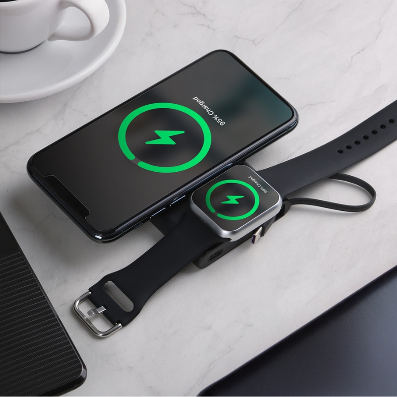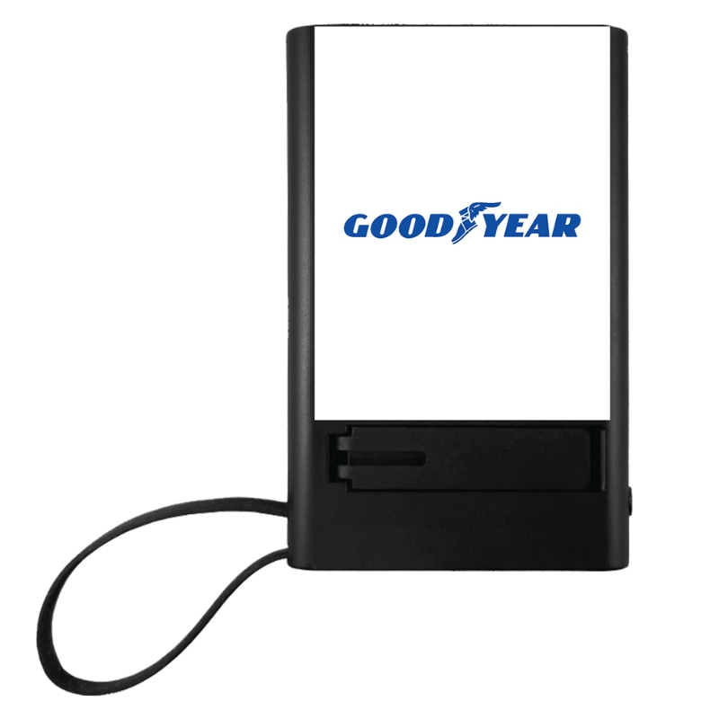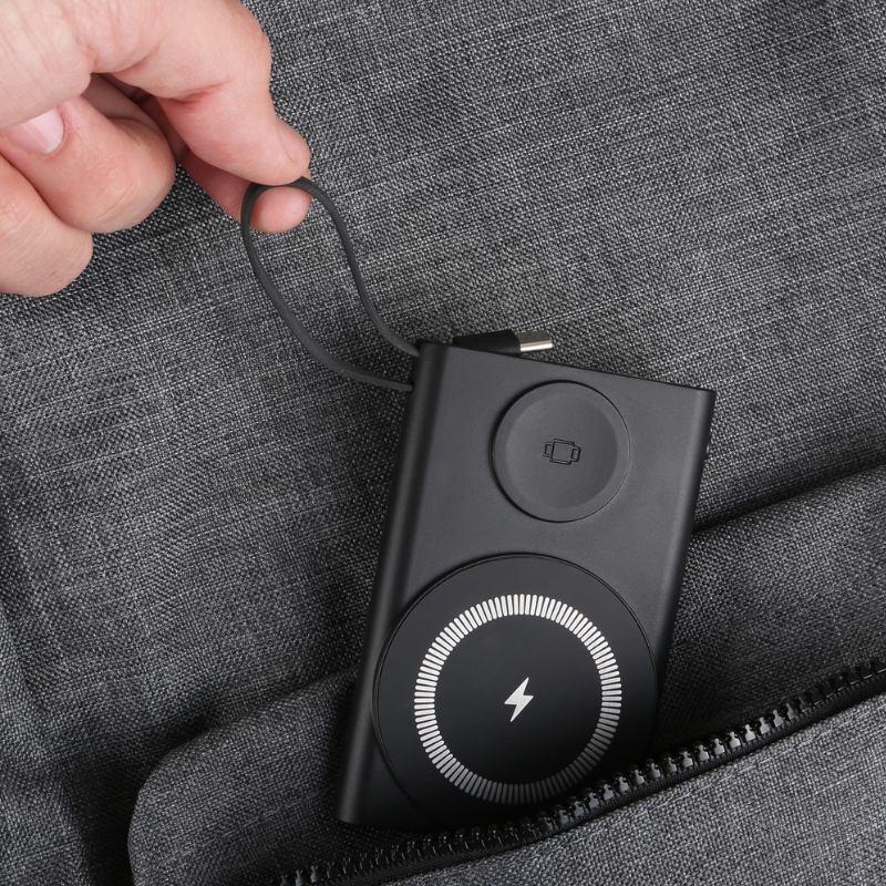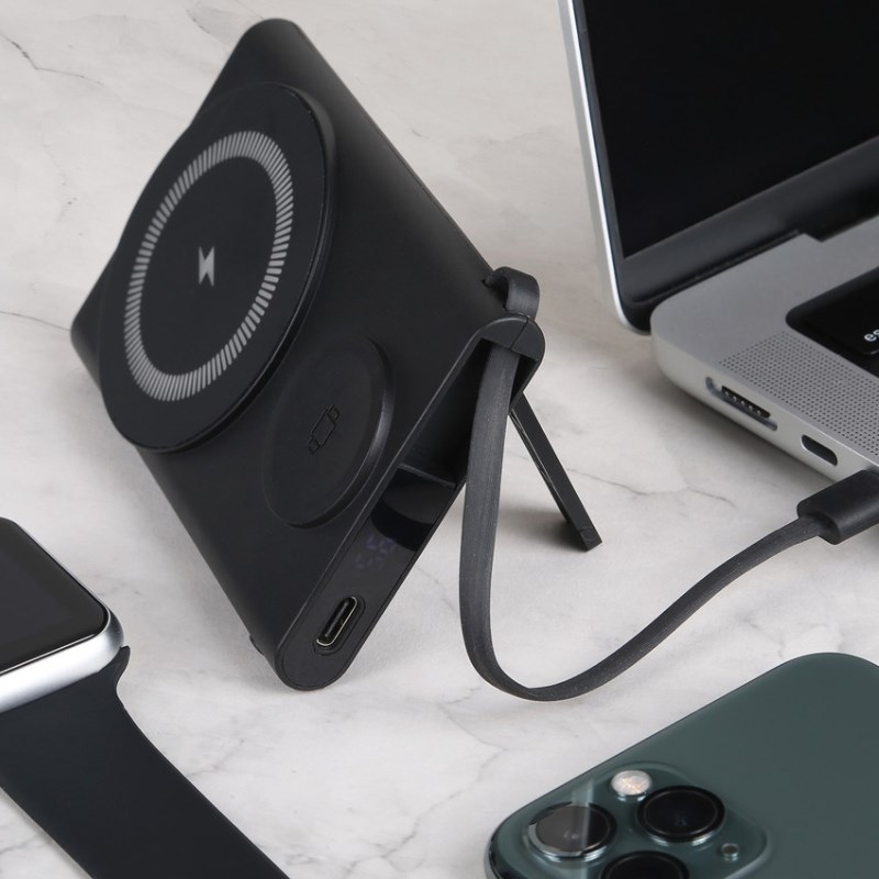The Wireless Lynx Power Bank is your all-in-one solution for staying charged on the go. With a 5000 mAh capacity, it offers reliable all-day power and features a magnetic wireless phone charger and a built-in Apple Watch charger. The included USB-C cable doubles as a convenient lanyard, and an integrated kickstand makes hands-free use easy. Made from recycled ABS, it’s an eco-friendly choice that blends sustainability with functionality. Perfect for tech-savvy users, events, or corporate gifting. Available in black.