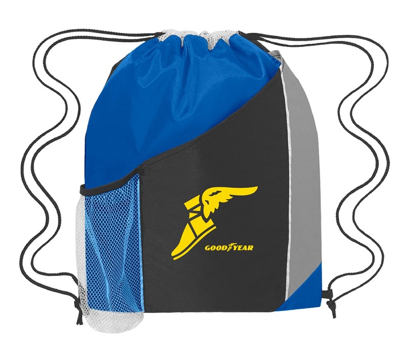 This drawstring sports pack is made of 210D polyester and features a large front pocket, side mesh pocket and drawstring closure. Printed with the Goodyear Wingfoot logo. Product Size: 13" W x 17 3/4" H